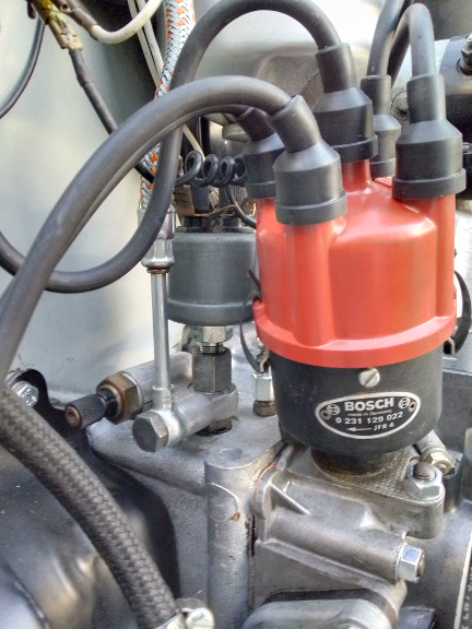 When the valve gear was installed and preliminary valve adjustment performed, we had left the engine rotated to TDC of cylinder 1 at the transition from compression to power strokes. So, we checked the point gap (it was perfect) and installed the distributor drive gear followed by the distributor. We then did a static time of the ignition so it would start readily. At this point we noticed that the distributor does not return fully to zero! The test is simple: Rotate fully clockwise and it should return to fully counter-clockwise. If it doesn't, the springs aren't returning it to the full idle (fully retarded) position for whatever reason. However, we were / are not tasked with fixing that, and since it won't negatively impact running-in the engine, we proceeded, continuing next with installing the new spark plug wires and distributor cap.