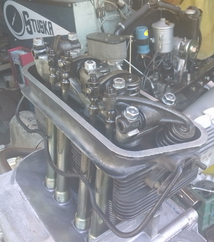 Upon reinstallation we found that more valve shimming was required on at least five valves, as much as a whole mm on at least four of them) (we say "at least" because we weren't recording it at the time, just noting this afterward) and this puzzled us - it indicates that perhaps the valves were shimmed a bit shy, and therefore the springing was a bit weaker, than it should have been during the previous rebuild, which can help explain the bent exhaust valves.