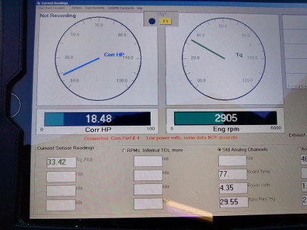 Here, we're transitioning from the second to third 20 minute period - note that the RPM, and hence torque (and HP) waiver up and down some, and there's no such thing as a precision like "exactly this RPM" ... We would be gently adjusting the throttle to get the RPM just where we want it except that we were busy taking photographs, so it's just close: