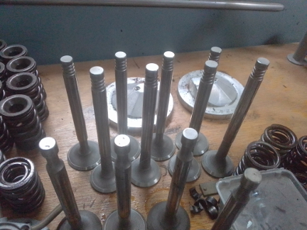 AT RIGHT: We always reface all valves that have been in service before reinstallation. ...Note that the four valves in the foreground are NOT for this engine - those are single-keeper groove type, used through the end of the B series in July, 1963.