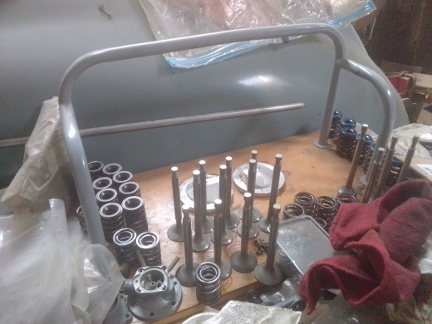 BELOW: This image shows the valves and our work area where we disassemble and reassemble heads. The grey tubing and wooden based tool is a special fixture that makes these operations easy, and you can see this tool in the various workshop manuals.