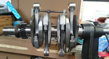 I usually take images of the rods by themselves, but on this occasion, I can't find the photos. (I got a new camera (phone!) at the time this was going together, so they may be on the old phone...) However, there's little need: In the image at right you can see that they're the late type by the way the rod caps protrude beyond the crankshaft, and how relatively "square" the rod bottoms are. And, you can see that the bushings are new, and that the rods have been balanced (bright spots on the little-ends are the give-away).