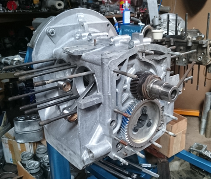 AT RIGHT: This engine is almost ready for the other half to be installed! Things were paused here to select the right sized gear.