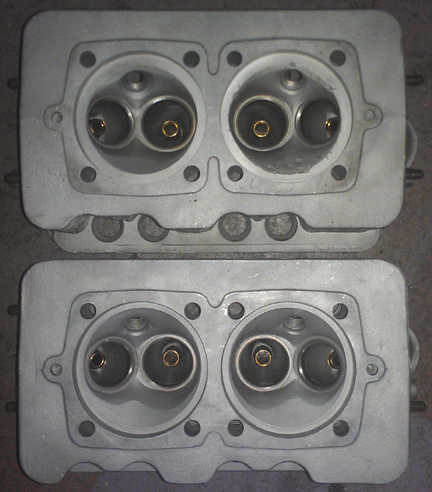 Note that these heads have never been cracked as 912 heads (and C / SC heads) are prone to cracking between the spark plug bore, intake seat bore, or exhaust seat bore - or any combination thereof - when overheated. Secondly, these heads have have new guides, and refaced valve seats. Thirdly, these are really the same heads, and NOT the awful, even more crack prone (without overheating!) air-injection 912 heads - or the even later ones where the casting has fin-loss at the place where the air injection formerly would have been. Finally, these heads have been carefully gone through to repair or replace any damaged studs or threaded holes, as necessary.