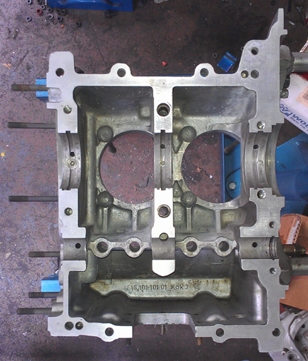 AT RIGHT: The left case half has studs and two round "anti-shuffle" sleeves at the center main bearing which were removed for lapping. Here you can see the case immediately after lapping. (Two dowel pins were also removed, but they're in the right case half.) The bright, clean face where the two halves meet is a characteristic of the case lapping process because this face is necessarily "lapped" smooth.