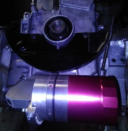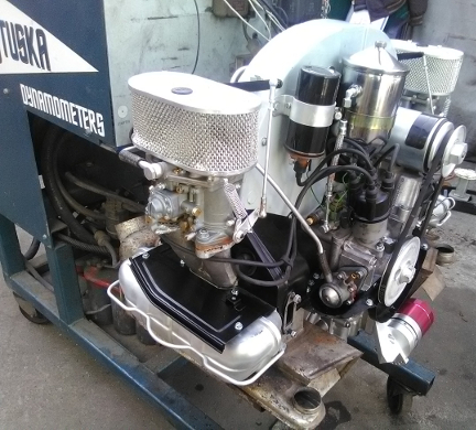 AT RIGHT: This engine, on the dyno - just a close-up from the image above. Note that it still has the new Webers on it, and not yet the spin-on full-flow oil adapter - see below for more on that.