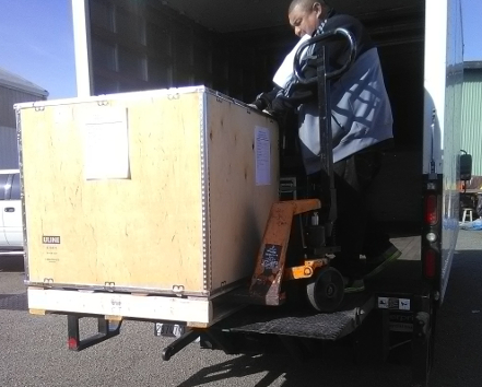 BELOW, RIGHT & LEFT: Here it is on the pallet that makes up the bottom of the box, attached to the crate. No time to clear things for a more pretty image, the trucker was already there pacing back and forth!