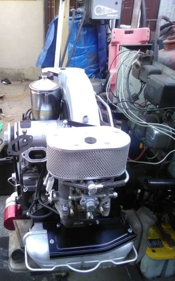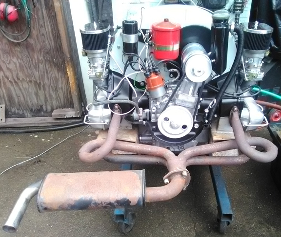 BELOW: The engine run with the newly rebuilt Solex 40P11-4s mounted specifically so they could be tuned. This required some serious doing because even though the customer had them done by a reputable shop, they float levels and injection quantities were way wrong and it took a fat half-day to rectify ... which contributed to not being fully ready the day before the shipment pick-up. (The muffler was a loaner. Note that it isn't that great anyway; pinholes.)