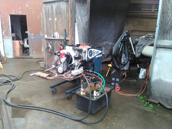 AT RIGHT: Dyno-day for this engine came on a rainy day! Thankfully, our Dynamometer is set up to be portable! We simply moved the running stand and control stand into the doorway of a large shed! The black hoses in the foreground are the water return hoses, the black hose running on the far side of the dyno is the supply line from the primary water pump, and the grey wire laying on the ground transiting from right to left and into the mass of hoses on the left is the interconnection between the dyno's control stand and the computer that controls the supply pump. On the right side of the dyno is a green hose - that's the vent. Then there's a red hose and that's the exit from the brake. Our Dyno can take two inputs and can have two outputs, but these secondary features are unnecessary when running-in engines and are only needed for very high horsepower output.