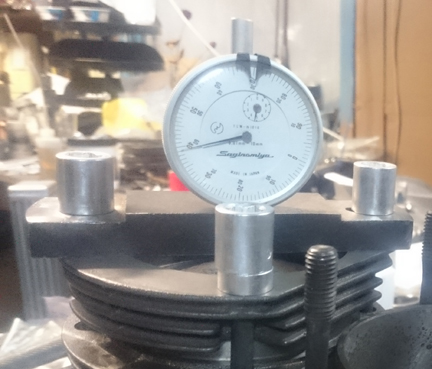 The next thing we do is something nobody else does (that we know of) in the engine building process, and that is to measure the height the piston crown comes above the plane of the top of the cylinder. I call this the CAC, or "Crown Above Cylinder." This value is important because, firstly, it can reveal deeper problems, and because it helps us get the compression ratio equal in all four cylinders.
