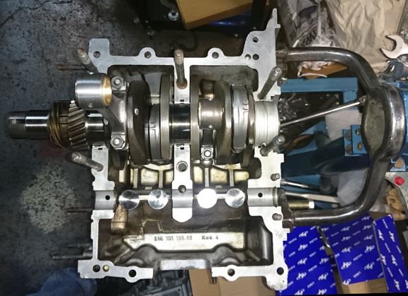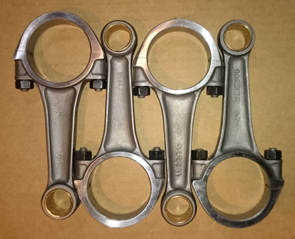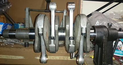 AT RIGHT:Crankshaft with rods. Note that these rods were remarkably well balanced as a set from new. Also remarkable is that Porsche used several manufacturers and for whatever reason most "sets" were mixed from different vendors and even different tooling from the same manufacturers, but these are all the same.