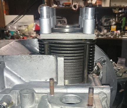 BELOW: The cylinders were then trial-fit into their bores in the case and retained with special tools to measure the cylinder heights and ensure they match their neighbor. This is the CHC, and both sides are done.