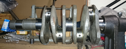 AT RIGHT: This crankshaft had formerly been re-ground and afterward protected with a coating of grease which dried on it. As we no longer have true solvents to use in cleaning, you can see a little of the remnants of the dried grease that was too stubborn to be wiped away - it'll dissolve in the oil used in assembly. Note that the gears are not yet mounted in this photograph.