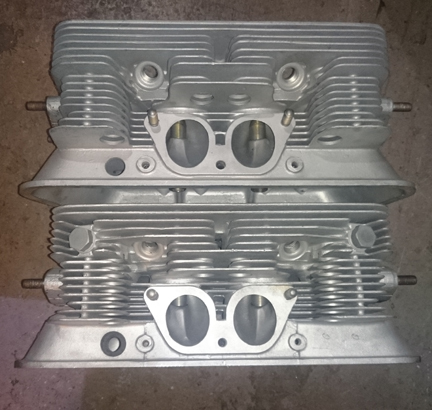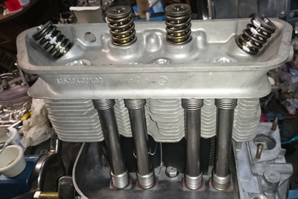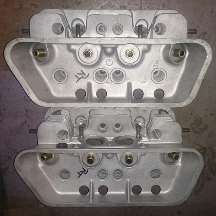 AT RIGHT: Note that all the fins and studs are in fine condition. All threads have been checked and ensured they're ready for service. The upper head is the period-correct one to match the case. The lower head is the next younger version - a perfectly suitable replacement. Notice the bolts serving as plugs to close off the ill-concenved air-injection ports which were an early attempt at smog control.