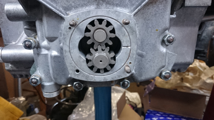 AT RIGHT: The oil pump gears have been mounted... The cover can be seen mounted, too, in photos up at the top.