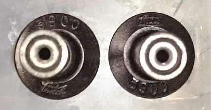 BELOW: While assembling this engine, I happened to notice that there were two types of the same type lifter! What?! Take a look in this image of the back-side of the lifter heads of the two versions of the same type lifter. Take a note, one side has the "Ate" logo and 3900 designation upside down as compared with the other one! Both were part of the same original set!