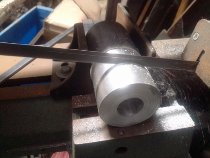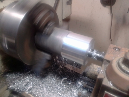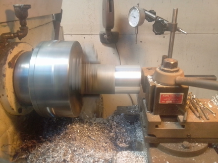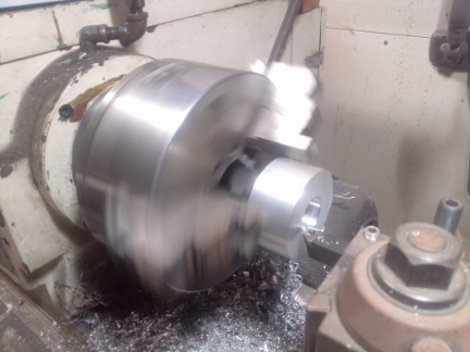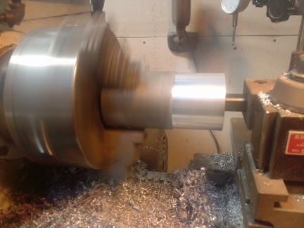 Note that they appear extra-wide. The one at bearing 2 (center of image) isn't extra wide but looks it because it's thick enough to serve in any bearing position and #1 is wider. The one at bearing 1 ("flywheel", right edge of image) is wider because of an issue with the ID: It turned out that the carbide cutter we were using to cut the ID had a chunk of AL stick to it as we finished the cut, so we just went deeper while we had the chance! We just didn't bother to cut off the excess length.