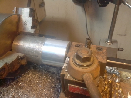 BELOW LEFT & RIGHT: What's happening should be obvious, but we missed taking some images between them, namely boring an initial bore through (deep enough in) the stock. The process was to simply start by using a small drill to center using the lathe to turn the part and a chuck in the tail stock to hold a bit. And then we stepped it up once to get a strong bit in there to go deep enough without any risk of breaking off the bit, and then a 3/4" bit to get us a bore large enough for our boring bar - the tail of which is seen in the image at right.