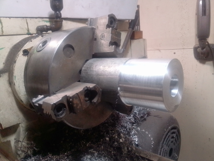 This is straight-up machine work. There are several ways to do this, but as an alternative to the round stock shown below, in the past we've started with a thick plate of aluminum, cut out a chunk big enough on a band saw, then drilled an M8 through-hole with a 1/2" step. This bore and step are so to fit it onto a special holder we made that lets us mount it in the lathe easily.