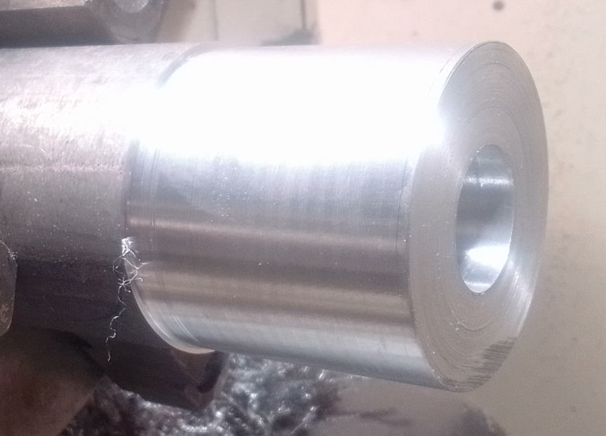 BELOW: Here you can actually SEE the issue with the bore change: Note the color change inside the bore! That's where, as the cutter was withdrawing for the last time, it got a burr - a chuck of AL - stuck to the cutting tip, thus making the bore larger! Oops! As noted above, our solution was simply to use the length to not have to re-do it. BE CAREFUL! Check your work! We always do!