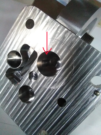 AT RIGHT: Here's the new in December, 2017 adapter showing the deeper hole that accommodates the now non-functional tachometer drive gear. This would be easy to fix with a plug and some machining except that the manufacturer performed a completely unnecessary step of adding a machined-in "pressure relief" for a non-existent pressure generated, in theory, from the lone tachometer drive gear spinning in a blind hole. The red arrow denotes that "pressure relief" notch in the left wall inside the bore. Harder to see, the bore has a step at the deepest point, again, for no known good reason, but it means a simple plug cannot fully fill the void.